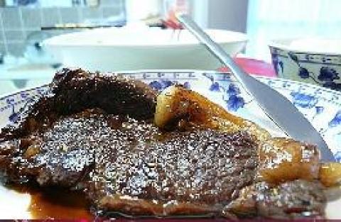 2.锅中火烧热,加少许油能勉,强盖住锅底就好,我们毕竟吃的是烧烤肉排不是炸肉排。待油热后,把腌制好的牛肉水分擦干平放在锅内煎。一面煎个2分钟再换另一面,适当撒些黑胡椒和辣椒粉能让肉排看起来更有feel。如果你喜欢半生的,那么翻过两轮以后就好,如果你不希望见到血丝那么推荐多翻那么几轮。