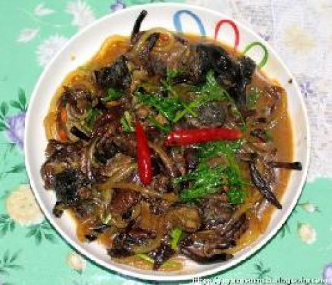 5.在加一枚大料,葱姜 蒜煸炒,再加两汤勺料酒, 几个干红辣椒,一点酱油(不要加多了,榛蘑颜色深).