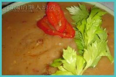 2.油热后,先爆香辣椒和姜蒜末,加适量水,然后投入粉丝,加盐、老抽、鸡精、胡椒粉调味,待锅开的时候,倒入调好的面糊,不停搅动,待汤汁收浓粘稠,鼓大泡的时候,关火,盛出即可。