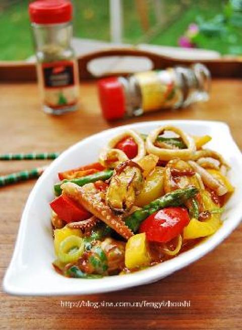 3.炒鍋中加一匙素油燒熱,爆香蔥花蒜片,放入燙過的海鮮與蘆筍,炒勻。烹入兌汁翻炒幾下,待湯汁均勻包裹住材料就起鍋。