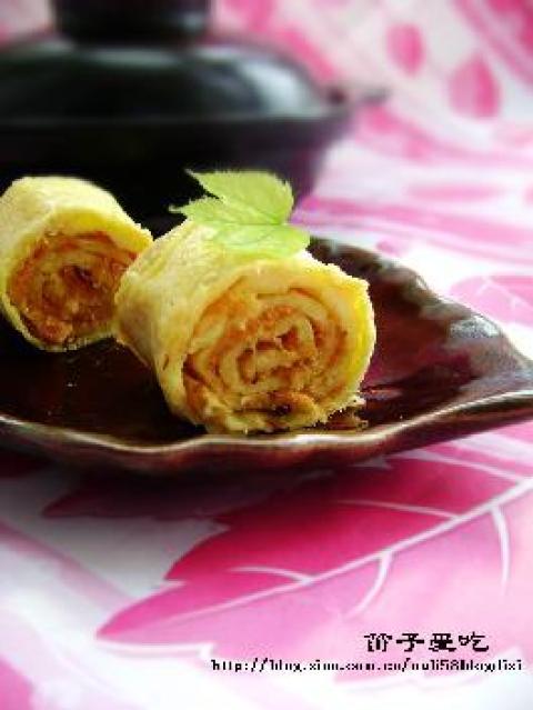 3.接着在空出的锅面上继续浇上适量的油,接着轻轻铲起煎好的蛋皮,同时再加入适量的蛋液,把原来的蛋皮放回前端,继续慢火煎熟蛋皮,然后重复把蛋皮对折,推向前端,形成一层又一层的蛋皮,在卷蛋皮的时候可以卷进一些肉松或其他喜欢的东西如海鲜,金针菇等(甚至辣酱,果酱或沙拉酱,只要你愿意)。