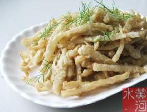 3.放在用绿豆面粉、淀粉、鸡蛋和好的糊中拌匀