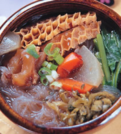 5.冬粉、胡萝卜、白萝卜以滚水以滚水汆烫至熟后,捞起放入大碗中,加入作法4的所有汤料,食用前加入葱花及酸菜即可。