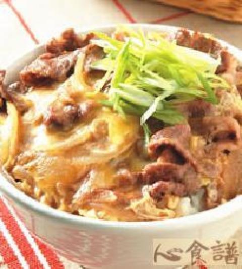 牛肉片80公克,洋葱50公克,鸡蛋1颗,白饭1碗,奶油5公克,味醂1大匙,酱油2茶匙,柴鱼汁50㏄