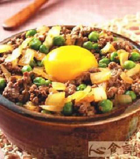 碎牛肉90公克,洋葱50公克,青豆仁30公克,蛋黄1颗,白饭1碗,奶油5公克,柴鱼汁50㏄,酱油2茶匙,味醂1大匙