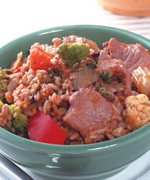 洋葱块20公克,西芹块30公克,红萝卜块20公克,猪里脊肉块200公克,五谷米100公克,南瓜泥80公克,白花椰菜10公克,绿花椰菜10公克,橄榄油1大匙,高汤600cc,盐1/4茶匙