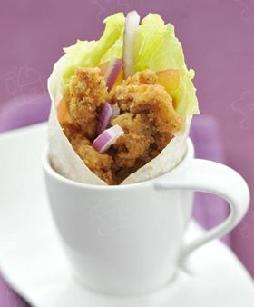 (6)取1片面皮,依顺序于面皮上放置1片西洋生菜洋葱丁、蕃茄丁及作法3的鸡肉条,再挤上适量的美奶滋,捲起包好即可。