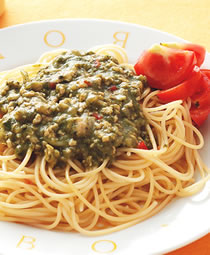 4.加作法3加入鸡粉与作法1的九层塔叶与巴西里汁拌匀淋至义大利面上即成。