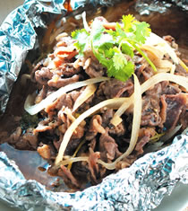 3.取2张长约30公分的铝箔纸,重叠成十字型,在表面涂上薄薄的沙拉油,再放上作法1的材料与作法2的羊薄肉片。
