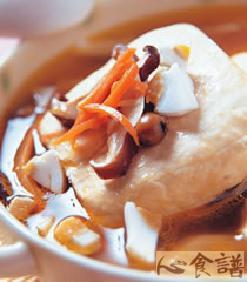 4.将豆腐移入深盘中,摆入作法3的料再注入汤汁,用蒸笼以大火蒸约20分钟。