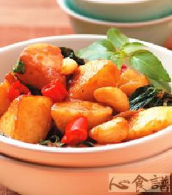 5.再于作法4中放入作法3的马铃薯块及作法1的调味料拌炒至略收汁后,再加入九层塔略炒一下即可。