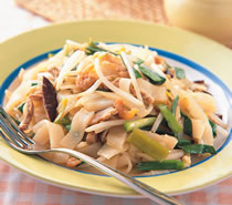 4.)加入粄条、韭菜段、豆芽菜、红葱头、葱段及调味料拌炒均匀,盛入盘中即可上桌食用。