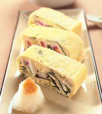 蛋5个,出汁150cc,酱油1小匙,盐少许,味醂1/2小匙,海苔1/2片,鱼板3片,新鲜香菇2朵,鸭儿芹2支,沙拉油2大匙,煎蛋器1个,萝卜泥适量,酱油适量