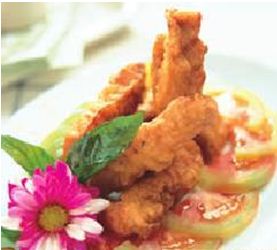 (3)加油加热至八分热,将鸡肉条沾裹面煳,放入油锅中炸成金黄色即可。