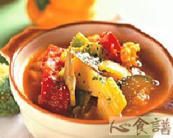 洋葱1/2个,番茄1个,西洋芹1支,节瓜1/2个,花椰菜1/4个,马铃薯1个,番茄酱2小匙,郁金香粉1/2小匙,月桂叶3片,盐1小匙