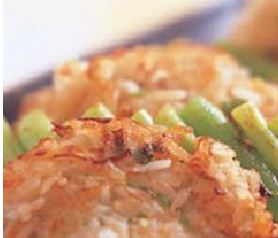 1.马铃薯丝先与剩饭拌匀,再拌入高丽菜和葱花,以胡椒粉、5公克的盐调味后,搓圆再压扁成厚圆片。