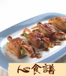 (3)取出腌好的鸡翅,将切好的鳕宝、红萝�与芦笋都塞进鸡翅里,8份全部作好之后,即可刷上适量烤香酱和黑胡椒酱,以上火220℃、下火200℃烤10~15分钟即可。