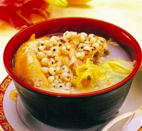 将鸡宰杀后退毛,去除内脏,洗净,将鸡肉连骨切成约3厘米大的方块,再用清水略漂洗一下,放入锅内;薏米碾碎下入锅内,加适量清水,调料入锅盖好锅盖。先用猛火煮开,除去汤面上的泡沫,改用文火炖熟后,即可食用。吃肉喝汤,酌量。