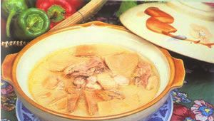 4.鲜汤烧沸后下归芪、老姜和氽好的鸡炖熟并加入盐、味精即可。