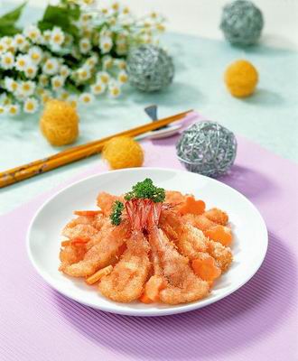 3.用蛋黄和面粉调成糊,虾裹糊后蘸面包屑。油加热至8成热时,放入虾炸至金黄色即可。
