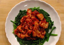 3、坐锅点火倒入油,放入肉片滑散后倒出控干油,锅中留底油,放入肉片,倒入调好的腐乳汁大火翻炒片刻,淋香油出锅浇在菠菜上即成。