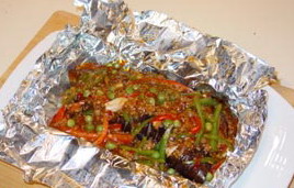 3、将制好的酱汁浇在茄子上,锡纸密封好,待烤箱预热后放入烤8分钟即可。