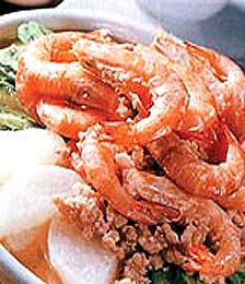 4)约熬40分钟後,再放进处理好之虾,并加酒调味去腥,虾熟後,加盐即成.