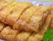 3.炒勺加底油,烧至五成热时,将其底部肥膘肉沾上面粉,拖上鸡蛋液放入勺内,用小火贴制到底部酥脆,加多量花生油氽炸到底部酥脆,上层软嫩成熟时捞出,然后改切长条块装盘。