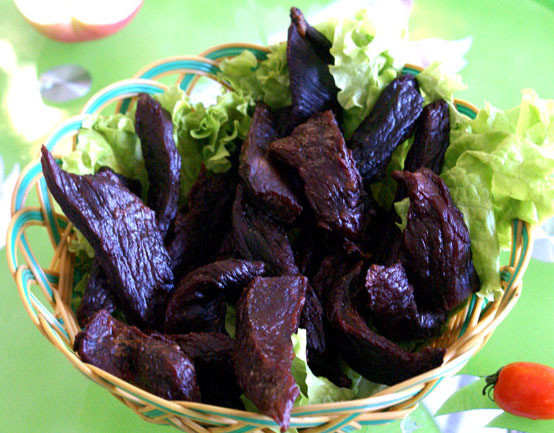 1.牛肉(后腿牛肉)剔去筋膜,片刀为大薄片,铺晒在簸箕上,放在通风地方,2至3小时即干燥。