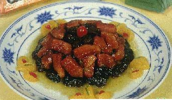 5、莲子摆碗内,周围摆蜜枣,上面放羊肉,撒白糖上笼蒸3小时后,扣入盘中,将熬过的蜂蜜淋上即成。