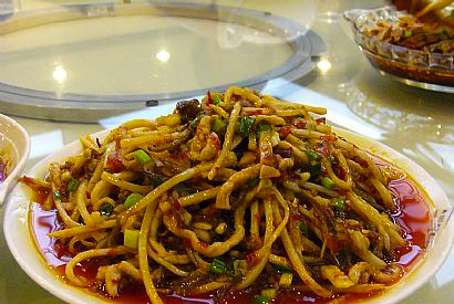 1脊肉切细丝,加调料入味后下6成热油中滑熟捞出沥油,锅留底油。