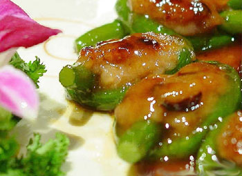 第一种:家常菜菜谱煎酿蒜苔如意结做法