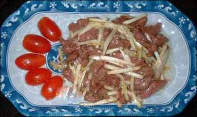 2.洗净牛肉,切成薄片,加精制油一条羹,加小苏打粉少许(约两粒黄豆大),拌韵,放冷藏室1-2小时;