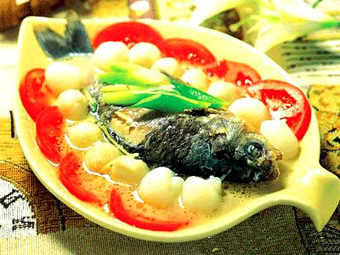 主料:鱼丸30克,白鲫鱼150克,生姜10克,蒜苗10克。