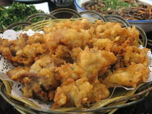 3.炒锅在旺火上加入油适量,烧至七成热,将拌上糊的肉片逐块散放油中略炸,多次用漏勺在油中捞起抖落(发现互相粘连时要拨开),然后捞出,油浇至七成热,再投入肉炸,用漏勺上下多次翻动,使它受热均匀,色泽一致,炸至略胀,成熟捞出,油再烧八成热,投入肉块,用漏勺上下翻炸,炸至外表缩瘪至呈皱纹形,桂花黄色,脆硬,捞出装盘。