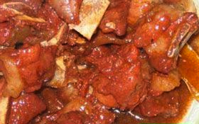4.锅中留油少许,下入红腐乳、调味酱稍炒,放入排骨、蒜瓣,烹料酒,加红曲末、水、白糖、味精烧开,摆入汤盆中,加原汤,上笼蒸透取出,去汤汁,把排骨摆入盘中;