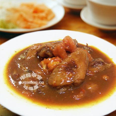 2、西红柿用开水烫皮,去蒂,切块;块状咖喱切成小块。