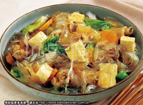 5、先放入豆腐块和粉丝,改中火,保持汤汁微沸煲8分钟。