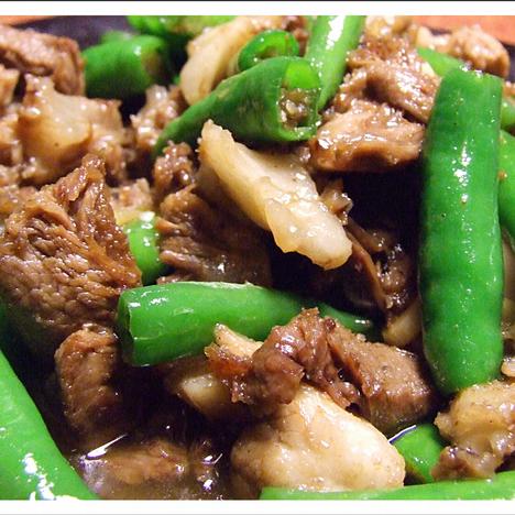 2、拆骨肉下油锅小火煸炒至香,下杭椒节炒熟。