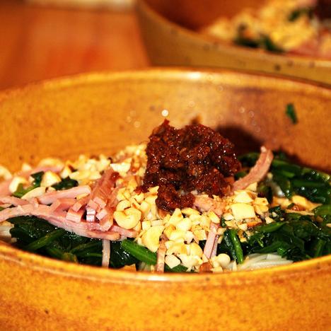 将花生碎、菠菜、火腿肉及适量辣酱放在面上;