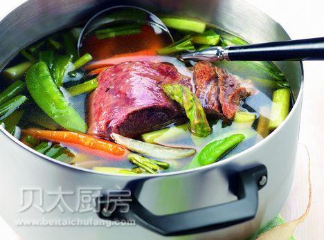 牛胸肉800g,小胡萝卜250g,绿芦笋250g(去皮切段),荷兰豆100g,白萝卜 1根(去皮切条),洋葱1个(切条),牛肉清汤2l,苹果醋1/2汤匙8ml,香叶 2片,百里香1汤匙15g,白胡椒粒1/2汤匙8g,盐1茶匙5g,白胡椒粉1/2茶匙3g