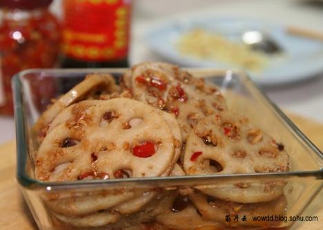 3、稍烫后捞出沥水晾干,将酱油、醋、辣椒油(烧油,再淋到辣椒粉上即可)、花椒粉(一点点就够了)、食盐、鸡精、姜末、蒜末、小葱末一起拌匀,洒到藕片上,盖上盖子,上下抖动,腌制半小时后就入味了。