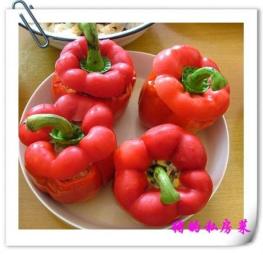 灯笼辣椒4个,香菇10朵,猪肉馅200克,玉米粒,碗豆少许,茨菇10个,盐,调和油,鸡精少许