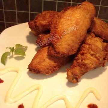 上脆炸粉和淀粉(比例是3比1),用手压尽量多的粉在鸡翅上。最后入油锅炸两次即可。