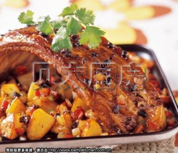 烤盘中铺好锡纸,在锡纸上撒油,将腌渍过的猪净肋排放在烤盘上,然后在四周均匀地铺上小土豆,并在肋排上淋上香辣豆豉酱。剩余的腌渍肋排的腌料汤汁淋在小土豆上。