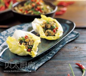 5、炒好的鸡米芽菜用生菜叶包裹起来同食。