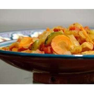 橄榄油1汤匙,洋葱1个,切成丁,蔬菜汁750毫升,胡萝卜2根,去皮,切丝,萝卜2根,去皮,切丝,红薯1个,切丝,小胡瓜(黄瓜)1个,切丝,红椒1个,切丝,罐装鹰嘴豆400克,沥干,番茄辣酱400克,肉桂粉1/4茶匙,姜黄粉1/2茶匙,藏红花粉1小搓,咖喱粉1小搓,粗麦粉350克