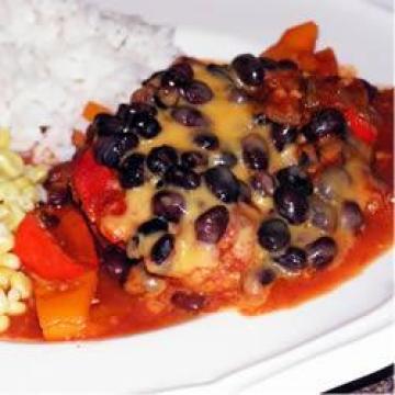 2.将鸡肉放入3公升砂锅或23x33厘米烤盘。将莎莎酱调料,红椒,孜然粉,柠檬汁,辣椒粉和大蒜在碗里混匀后倒在鸡肉上。然后再倒入黑豆在上面。盖上烤盘(或锅盖),放入预热烤炉里烤1至1 1 / 2小时即好。可配米饭或玉米饼吃。