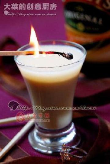 材料:百利爱尔兰奶油威士忌(baileys)4/5杯,伏特加酒1/5杯,火柴