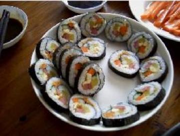 2、用紫菜海苔把米饭铺平,放上各配料,用竹席把它们卷起,包紧,然后切块。